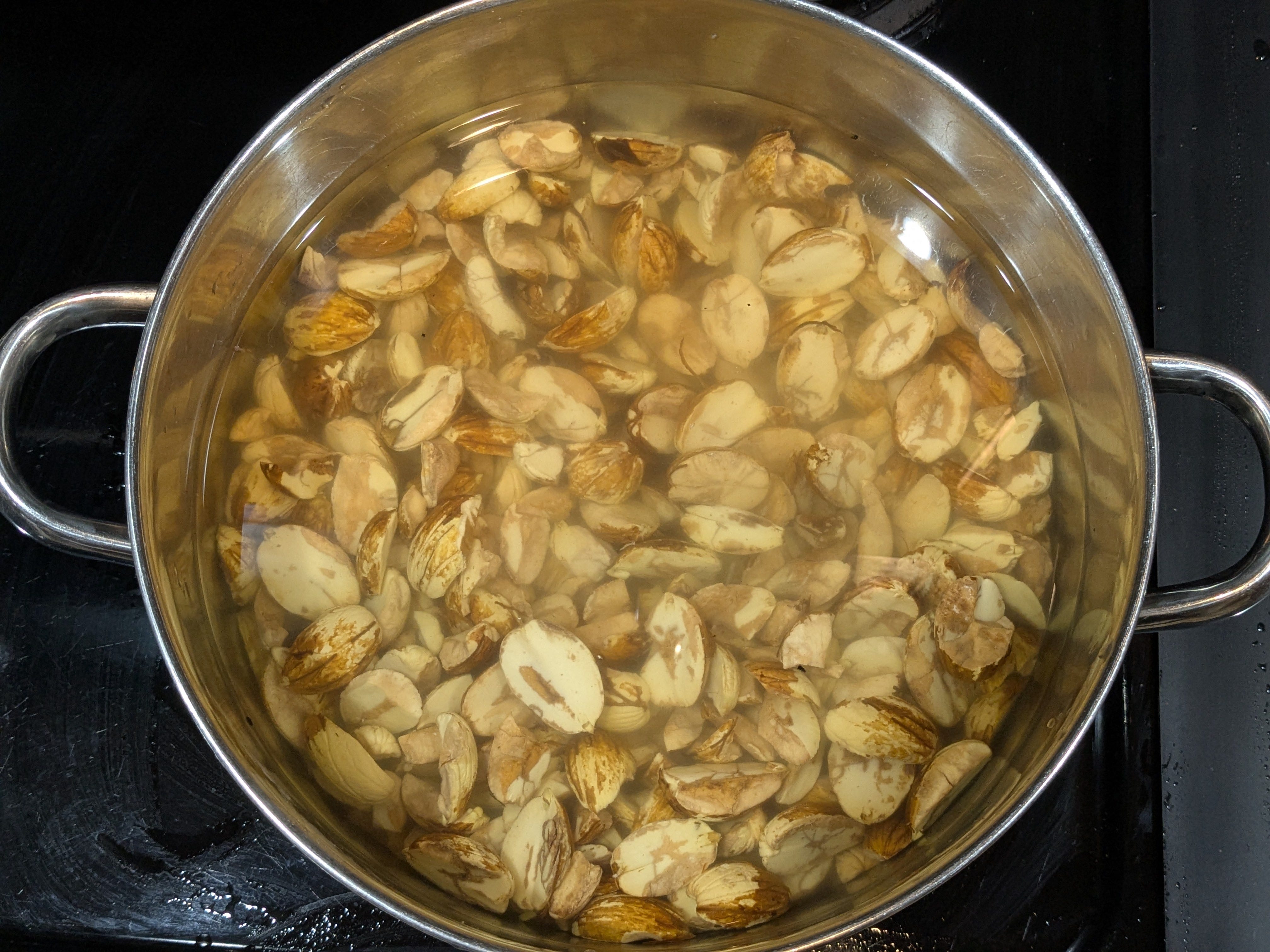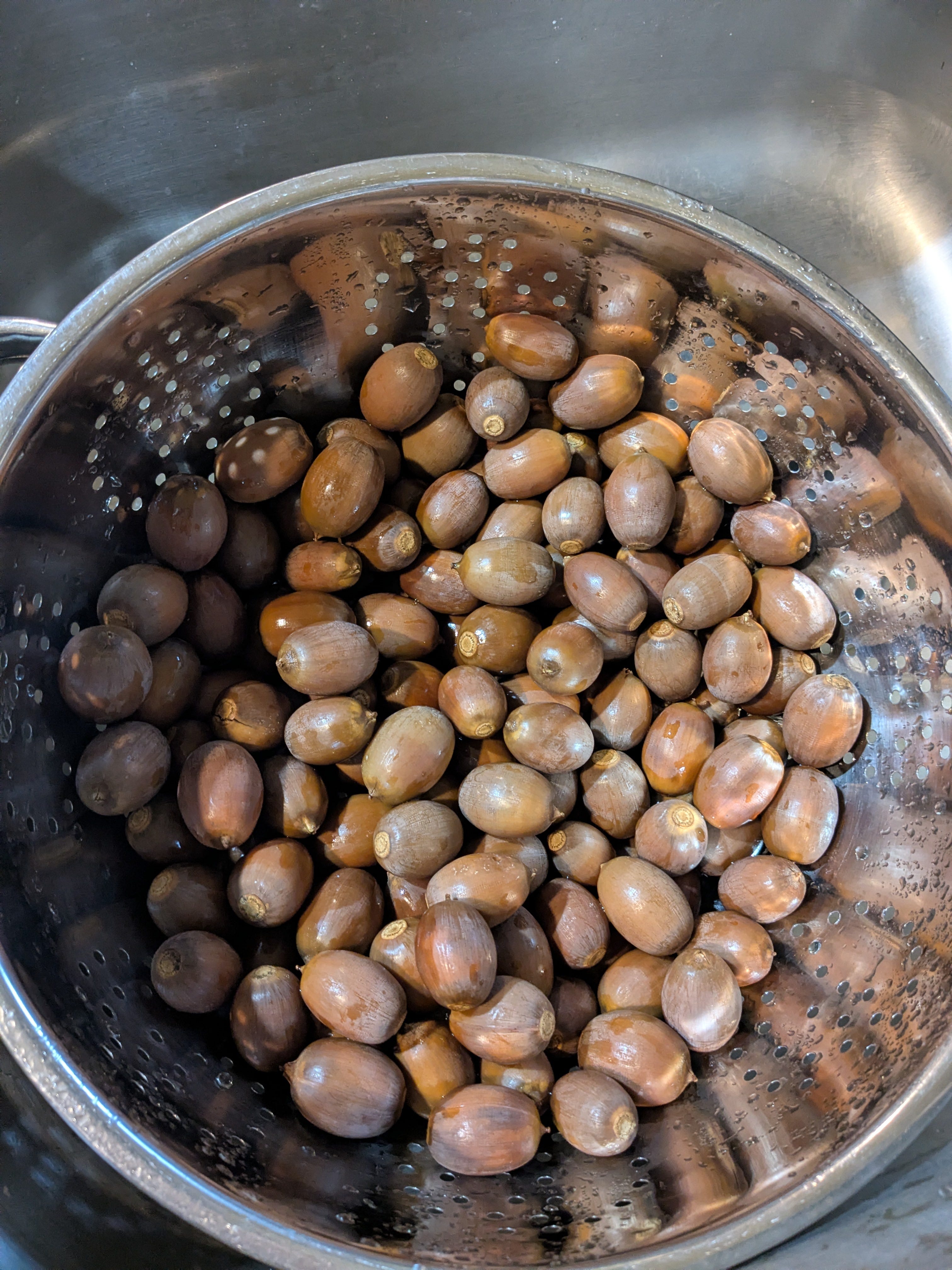 We boiled the acorns meat for fifteen minutes, than dumped out the water than rinsed the acorns about 4 times. That part alone took about an hour or more. This method was to remove the tannins. Don't get me started on chucking the damn things. That was monotonous, and also took at least an hour.
